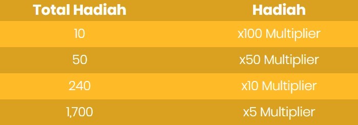 4. Pemain akan memenangkan hadiah berupa multiplier dari jumlah taruhan seperti yang tertera di Tabel hadiah.