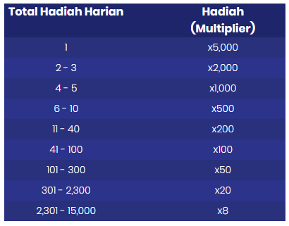 7. Pemain akan memenangkan hadiah berupa multiplier dari jumlah taruhan seperti yang tertera di Tabel hadiah.