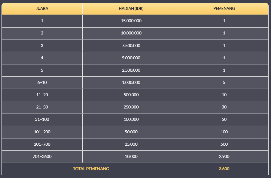 2. Total hadiah Rp 2,2 MILIAR akan dibagikan kepada 72.000 pemain setiap hari selama periode promo berlangsung.