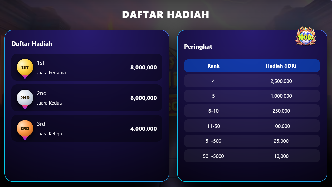 2. Total hadiah IDR 2,6 MILIAR akan dibagikan kepada 5000 pemain setiap hari selama periode promo berlangsung.